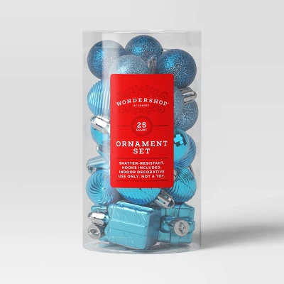 This 25-Count Assorted Shatter-Resistant Christmas Tree Ornament Set from Wondershop™ is perfect for trimming your tree or seasonal gift-giving. Made of plastic, this set includes 25 ornaments in assorted shapes, colors and textures, giving you plenty of options to decorate your tree to your heart’s content. Suitable for indoor use, these shatter-resistant ornaments come in a transparent box and have hanging hooks for easy placement on your tree’s branches.