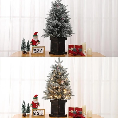 【Realistic Beauty】Featuring elegantly crafted non-toxic PVC foliage, our pre-lit artificial tree delivers strikingly lifelike branches and a natural snowy look—even without snow in the forecast.【8 Lighting Modes】Powered by 3×AA batteries (not included), this 3FT tree offers 8 light settings: Combination, In Wave, Sequential, Slo Glo, Chasing, Slow Fade, Twinkle, and Steady On. Its 2700K LEDs stay lit even if one burns out. The tree is fire-resistant and hypoallergenic.【Smart Timer】Equipped with a 6-hour automatic timer, the 78 LED light string shuts off after 6 hours and restarts after 18 hours. Enjoy daily auto-on lighting, saving energy while adding cozy ambiance day and night.【Stable Cement Base】The tree features a sturdy cement-filled pot base concealed by a sleek lightbox—offering both durability and style, and blending easily into your home decor.【Lifelike & Safe Construction】Crafted with fire-resistant, hypoallergenic branch tips and hundreds of individually molded “Feel Real” branches, this tree ensures a full, authentic silhouette and lasting holiday charm.Ideal for indoor/outdoor use. Simply unbox, shape the branches, insert batteries, and it’s ready. Dimensions: 22″D x 22″W x 36″H. Weight: 6.4 lbs.