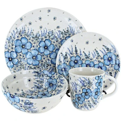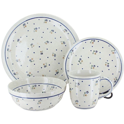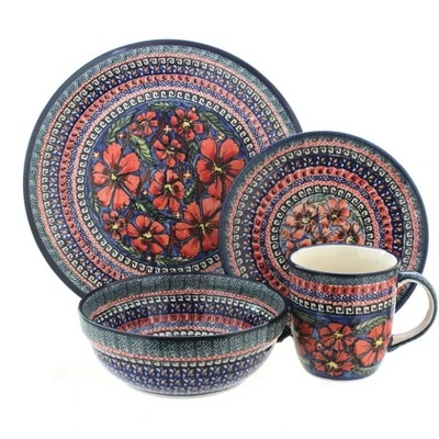 4 Piece Place Setting – includes 1 dinner plate, 1 dessert plate, 1 cereal/soup bowl, and 1 coffee mugDinner Plate – 10.75″ diameterDessert Plate – 7.5″ diameterCereal Bowl – 18 oz. capacity, 6.7″ x 2.6″Coffee Mug – 12 oz. capacity, 3.75″ high The Art of Polish Pottery, as we know it today, started as local folk art centuries ago in the German province of Silesia. The first known pieces of “Bunzlauer” stoneware dating back to the 16th century were crafted by hand and decorated with a folk art stamping technique using potatoes. Original designs were inspired by the peacock feather using the colors of cobalt blue, sage green and ferrous red. These designs and colors are still the inspiration for modern day patterns.Today, skilled Polish artists still individually handcraft and hand decorate each piece using small sponges to stamp each pattern and color. After the process of mixing ingredients, molding the pottery, applying the decorations and glaze, the pottery is twice fired. This process makes the pottery extremely durable, it will not crack or chip easily, and it is perfect for use in the microwave, dishwasher, oven and freezer. Along with our pottery, we have sourced a range of absolutely beautiful hand blown glassware from Poland. It is the perfect addition to your Polish Pottery Collection!