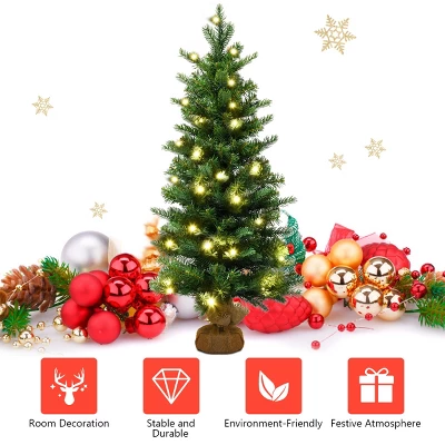 This is our 3ft tabletop christmas tree, which is perfect for adding a holiday joy to your home or office. It features simple green color, 363 branch tips design to help emulate a real Christmas tree. This Christmas tree is decorated with 50 warm LED Christmas string lights to brighten your space and create a warm and romantic atmosphere to the house. Its timer function allows you to choose to light on for six hours or keep lit. The classic Christmas tree comes with a cement base for added stability. Enjoy your holiday with this compact design Christmas tree, even when you have little space! Don’t hesitate to buy it!