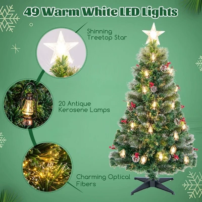 Elevate your festive decoration with a realistic 5/6/7 ft Xmas tree adorned with 170/220/270 lush branch tips, snowy pine needles, 16/20/24 natural pine cones, and 16/20/24 clusters of red berries. Illuminate your space with 49/64/80 warm white LED lights, which are distributed among the treetop star and 20/30/34 antique kerosene lamps, offering a charming lighting display. With 8 lighting modes, such as chasing/flash, slow fade, sequential, twinkle/flash, slo-glo, and more, the Xmas tree becomes more attractive. Thanks to new PVC, the decoration tree is safe, smell-free, non-allergic, and fireproof. The Xmas tree comes with gloves and spare kerosene lamps for your convenience. Experience the warmth of winter with this elegant and practical Christmas tree. Merry Christmas!
