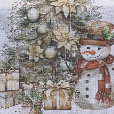 Holiday hues meet a casual Christmas classic with this adorable snowman table runner. The rustic watercolor print features three detailed snowmen dressed with top hats and scarves in a wintery scene surrounded by pine trees and holly berry plants. Soft and absorbent to the touch, this reusable table topper is constructed of a premium cotton blend material with a seamless stitched hem perfect for both every day and special occasion meals. Create a seasonal kitchen table setting for Christmas holiday parties and winter family gatherings with this decorative dinner mat, making casual and formal meals a festive experience.