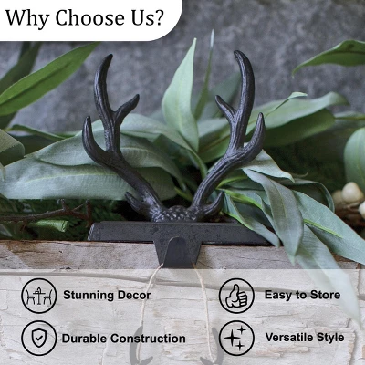 Add a rustic winter inspired accent piece in your Christmas decorations with this traditional and stylish deer stocking hanger. Crafted from durable iron metal, this decorative stocking holder features a traditional antler design that is durably crafted to last for many holiday seasons to come. Once placed on a mantle, shelf, or bookcase, this decorative single hanging hook will enhance most living room, family room, and seassonal holiday decor. Pair this weighted stocking hook display with more stylish holiday home pieces from the rest of the Eva & Co. designer line collection for a modern farmhouse styled Christmas space.